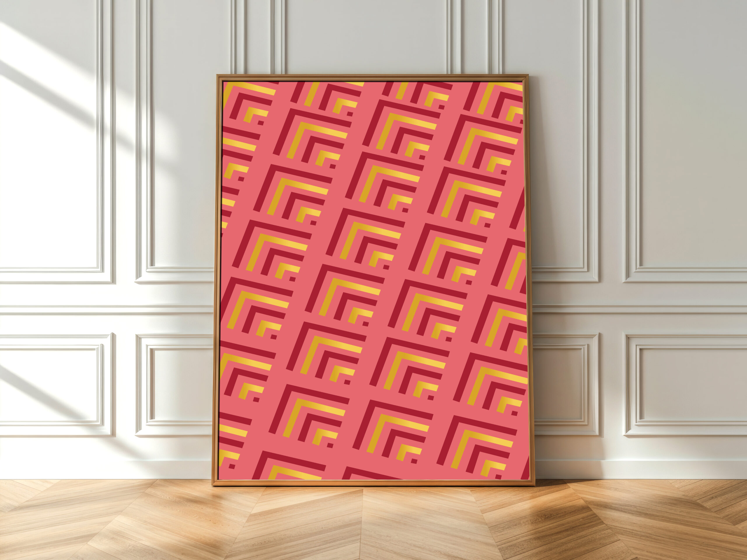 A vibrant yet refined patterned illustration in red, pink, and golden hues. Designed to add warmth, richness, and a touch of artistic elegance to your space.